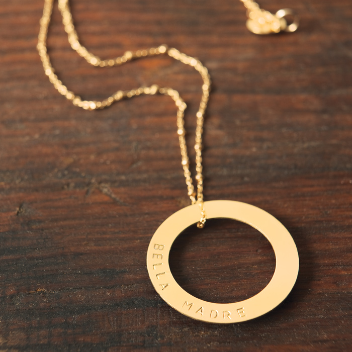 An embodiment of love both pure and true captured in a gift of gold. The words “Bella Madre” meaning “Beautiful Mother” are stamped in a 1 ½" diameter 14-karat gold filled hoop using the art of lost wax casting. Delicate 14-karat gold filled chain measures 18". Necklace comes gift wrapped in a hand crafted wood crate with ribbon.