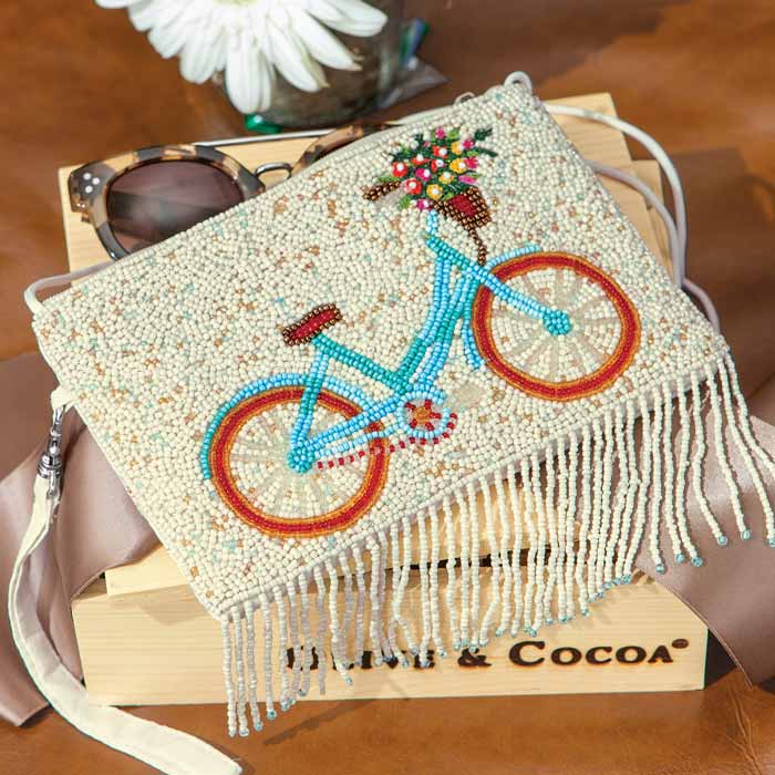A dash of bohemian style keeps her valuables close while she’s on the go. Hand beaded in a distinct bicycle pattern, wristlet has a zipper-top compartment, a snap-close compartment, an over-the-shoulder shoelace string, and a detachable wrist strap. Wristlet measures approximately 7 ½" x 5" and arrives gift wrapped in a hand crafted wood crate with ribbon.