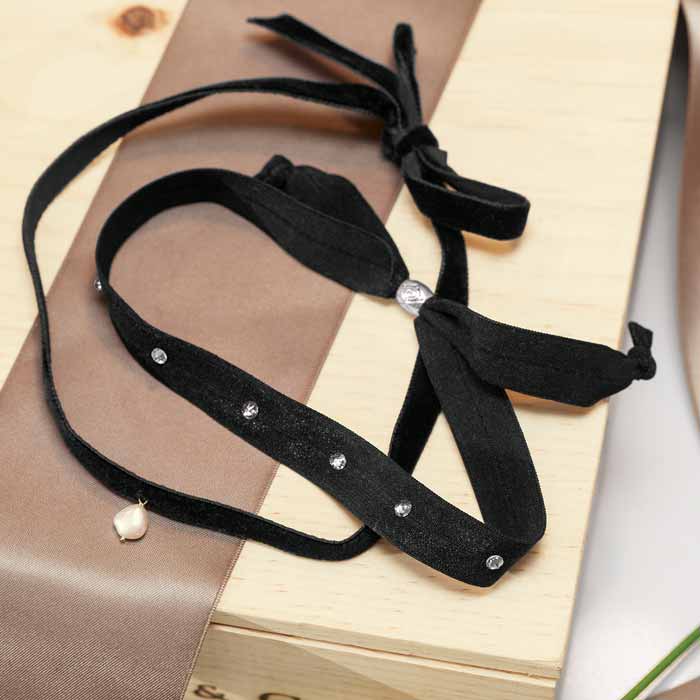 We’ve given two iconic chokers mod makeovers. With luxurious black velvet, our 25" tie-to-close choker is graced with a dainty baroque pearl. Studded with gleaming SWAROVSKI® ELEMENTS, our 20 1/2" stretchy choker has an adjustable, sliding closure. Set of two (one of each design) arrives gift wrapped together in a hand crafted wood crate with ribbon.