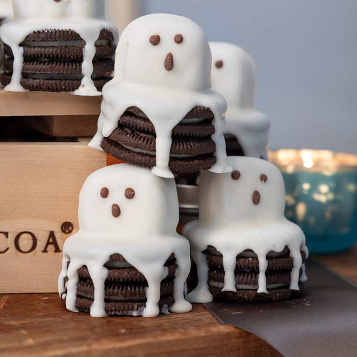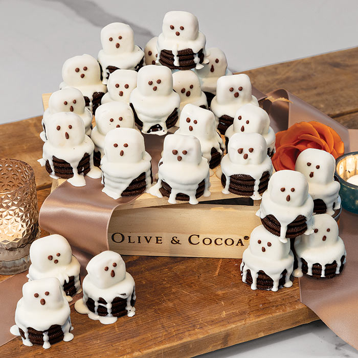 Scrumptious, sweet, and spirited, our Ghostly Boo Bites are hand made with a double stack of sandwich cookies topped with caramel and drizzled with white chocolate. Medium includes 12 Ghostly Boo Bites and large includes double the treats. All arrive gift wrapped together in a hand crafted wood crate with ribbon.