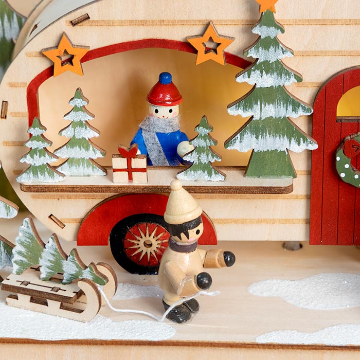 This Christmas Camper is absolutely adorable. It comes with batteries needed. Turn on and leave it. The timer will automatically turn off the lights and turn them back on the next day. It looks larger in the catalogue than it actually is, so it fits well on a small end table. It is so precious, I am ordering another. These WILL be sold out, so get yours now.