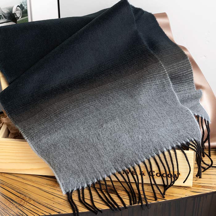 Send a dapper accessory that can complement everything in his wardrobe from his favorite hoodie to his 3-piece suit. Woven of plush cashmere in shades of black and grey, Men's Gradient Cashmere Scarf measures approximately 12" x 72" including fringe and arrives gift wrapped in a hand crafted wood crate with ribbon.