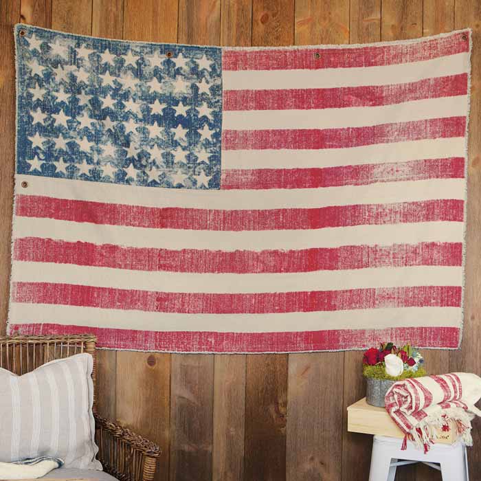 Make Old Glory the center of attention. Woven of cotton muslin and ready to grace walls or be displayed from porches and rafters, tapestry features a distressed finish, subtly frayed edges, and metal grommets. Measuring an incredibly grand 4 feet by 6 feet, tapestry arrives gift wrapped in a hand crafted wood crate with ribbon.