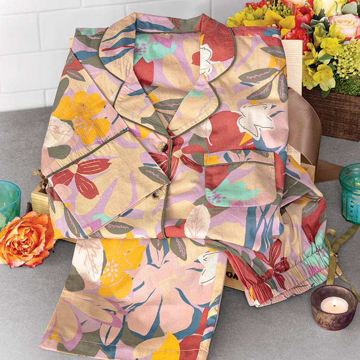 Designed exclusively for Olive & Cocoa®, our Harvest Bloom Pajamas bring unique floral artwork to her sleepwear. Woven of a soft cotton blend, pajamas have a long sleeve button front shirt and elastic drawstring waistband pants. Available in women’s sizes small, medium, large, and extra large, pajamas arrive gift wrapped in a hand crafted wood crate with ribbon.