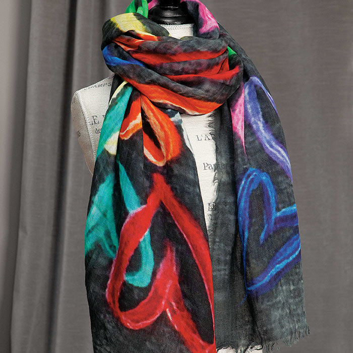Bright and colorful graffiti hearts pop against a charcoal background. Warm enough for winter but delightfully lightweight, our ultra-soft wool scarf with raw edge detailing is a wonderful layer year-round. Measuring approximately 75" x 40", scarf arrives gift wrapped in a hand crafted wood crate with ribbon.