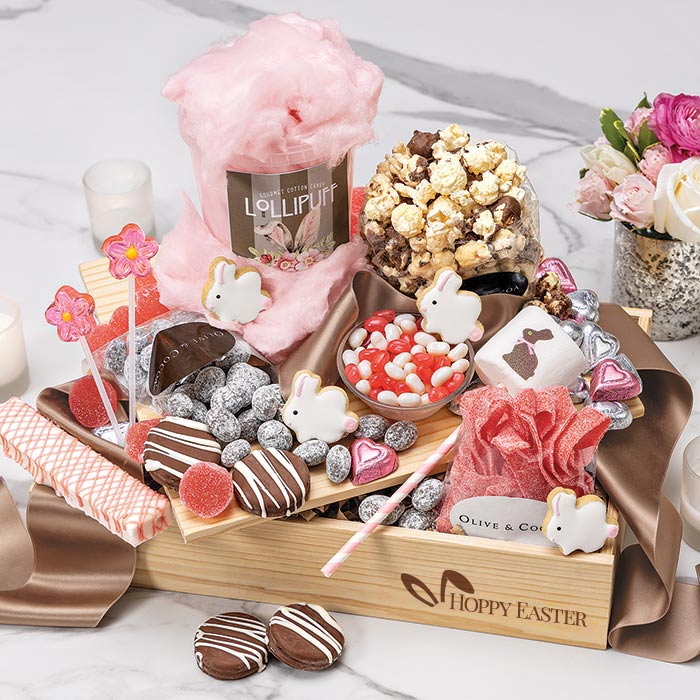 A mouthwatering collection of chocolates and sweets, our Sweet Bunny Treats crate includes rocky road popcorn, sour strawberry belts, pink & white jelly beans, 4 mini bunny cookies, and a white chocolate marshmallow bar. Medium adds chocolate toffee dusted almonds and 2 pink daisy lollipops. Large adds 4 chocolate covered sandwich cookies, foiled heart milk chocolates, fruit gummy discs, a bunny marshmallow pop, and cotton candy. All arrive gift wrapped together in a hand crafted wood box branded ”Hoppy Easter.”