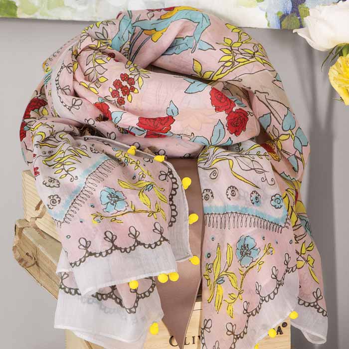 A sunny garden is bordered with cheerful yellow poms on this softly colored 100% cotton scarf. Measuring approximately 64" x 40", scarf arrives gift wrapped in a hand crafted wood crate with ribbon.